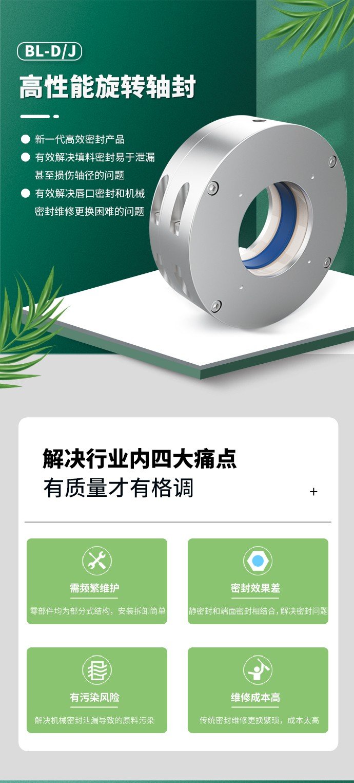 高性能旋转轴封包括BL-D、BL-D/J二个系列。轴向密封为静密封,径向密封为动环和静环形成的端面密封。